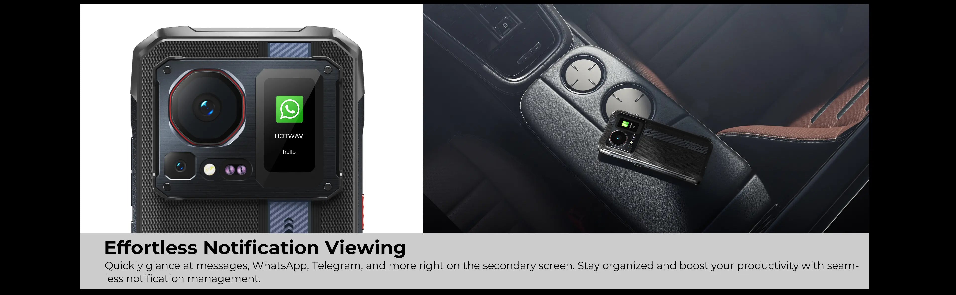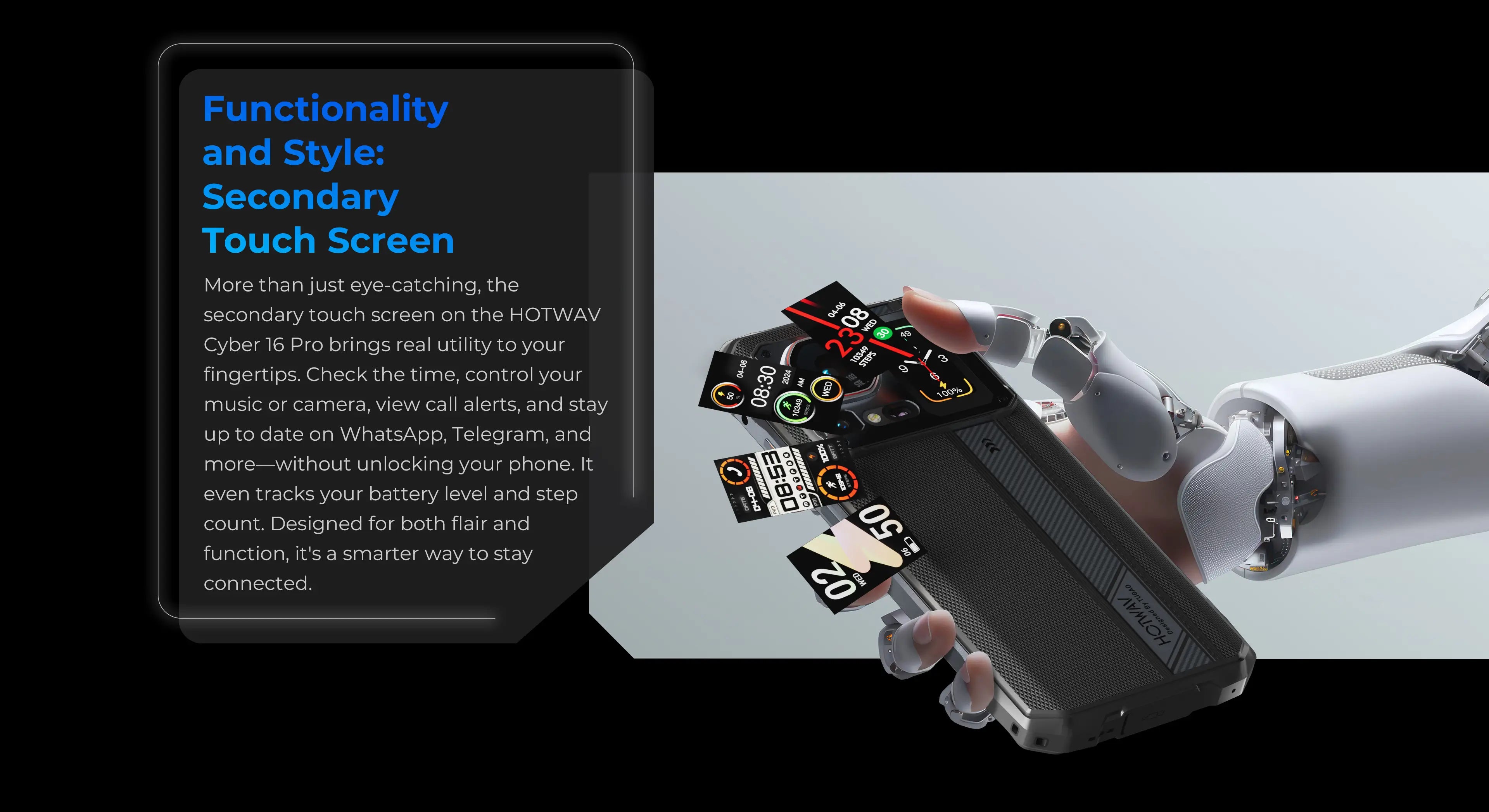 More than just eye-catching, the secondary touch screen on the HOTWAV Cyber 16 Pro brings real utility to your fingertips. Check the time, control your music or camera, view call alerts, and stay up to date on WhatsApp, Telegram, and more—without unlocking your phone. It even tracks your battery level and step count. Designed for both flair and function, it's a smarter way to stay connected.