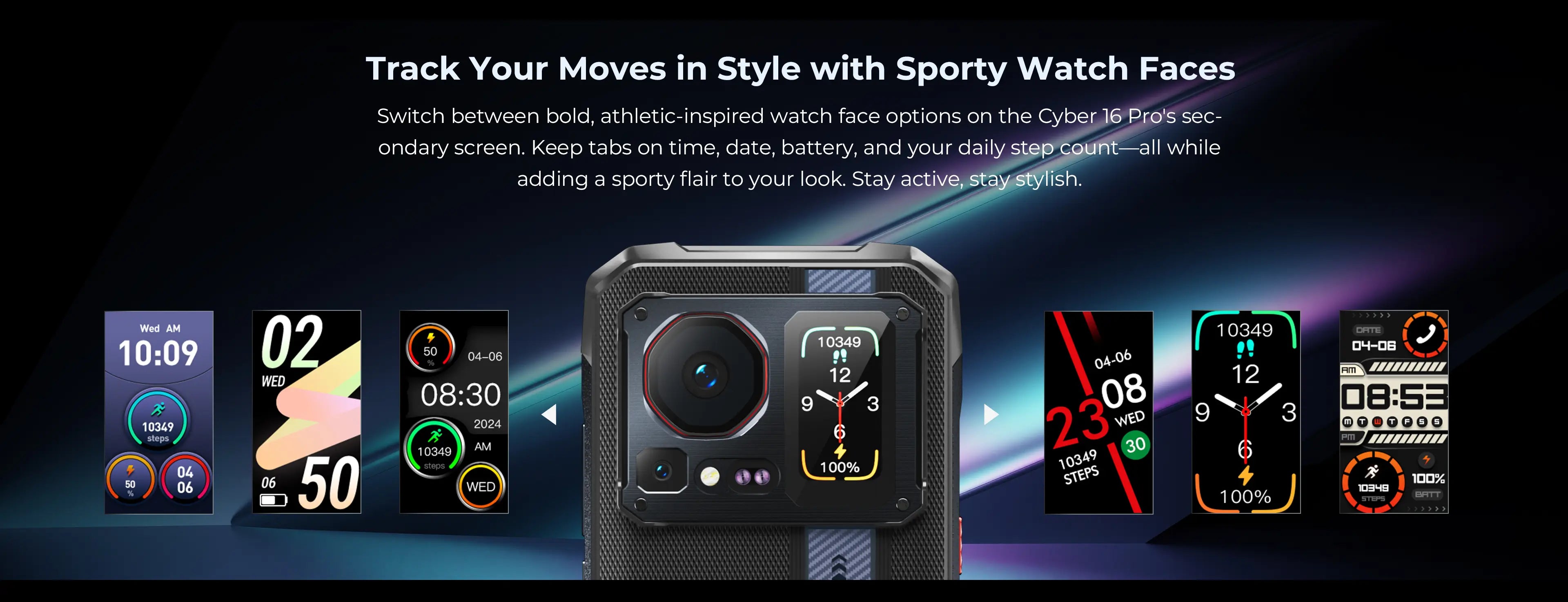 Switch between bold, athletic-inspired watch face options on the Cyber 16 Pro's secondary screen. Keep tabs on time, date, battery, and your daily step count—all while adding a sporty flair to your look. Stay active, stay stylish.