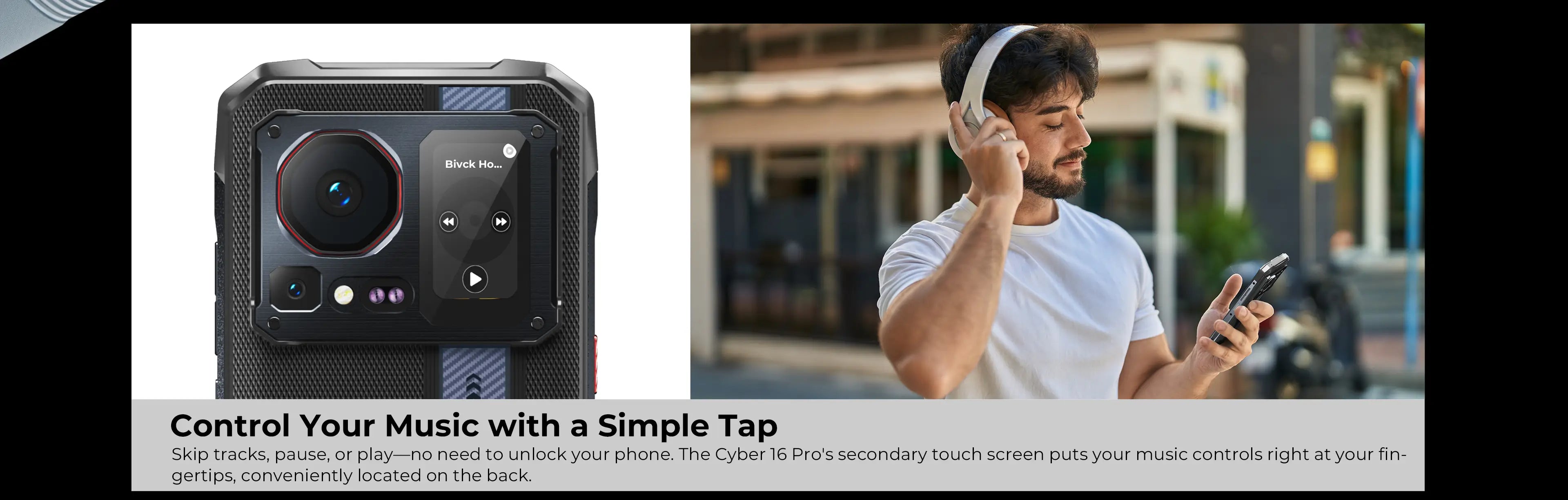Skip tracks, pause, or play—no need to unlock your phone. The Cyber 16 Pro's secondary touch screen puts your music controls right at your fingertips, conveniently located on the back.