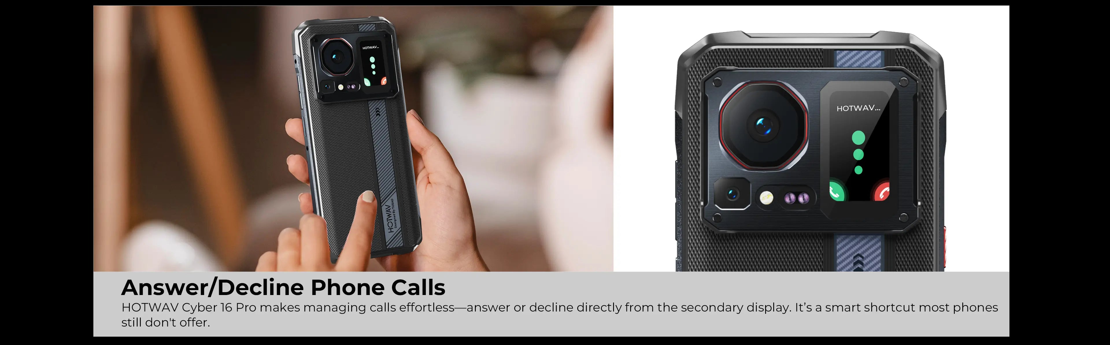 HOTWAV Cyber 16 Pro makes managing calls effortless—answer or decline directly from the secondary display. It’s a smart shortcut most phones still don't offer.