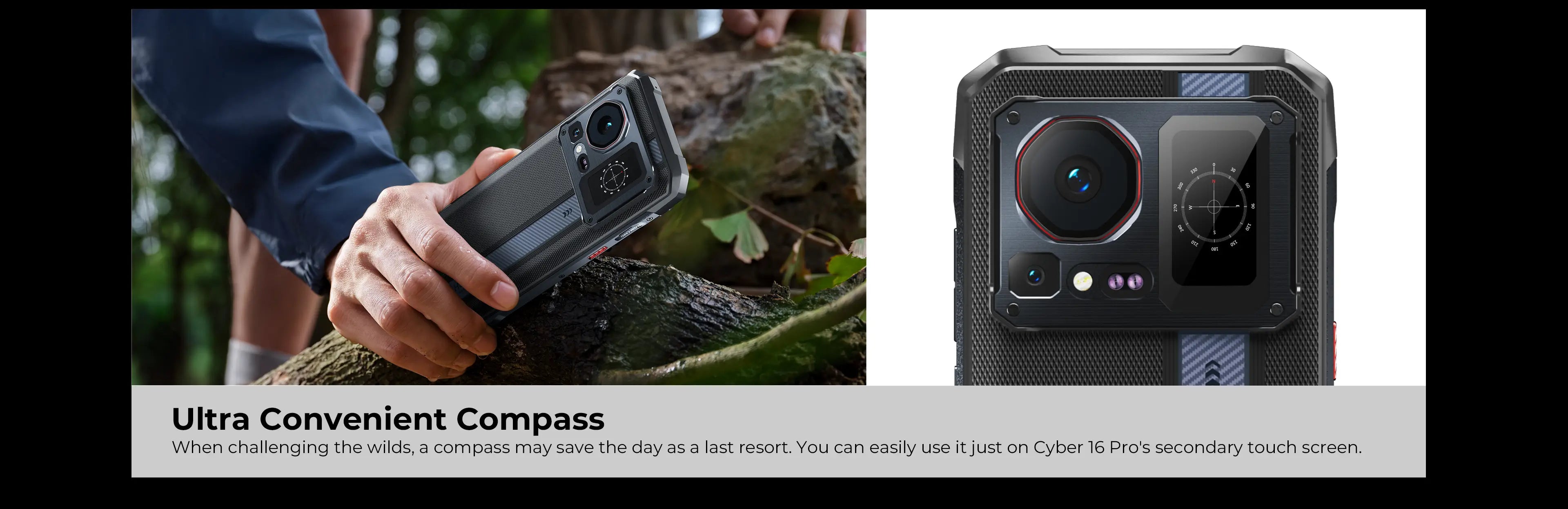 When challenging the wilds, a compass may save the day as a last resort. You can easily use it just on Cyber 16 Pro's secondary touch screen.