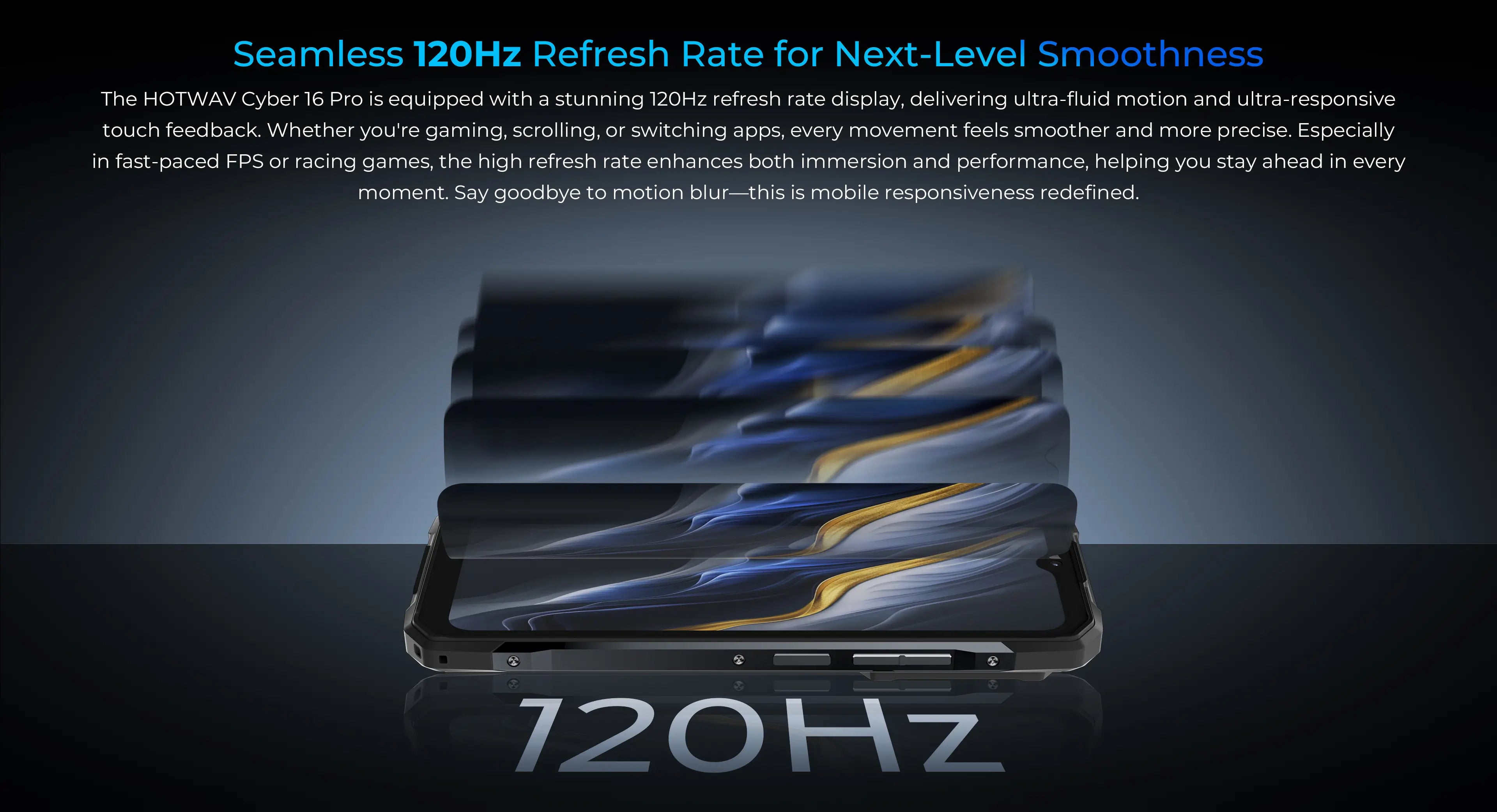 The HOTWAV Cyber 16 Pro is equipped with a stunning 120Hz refresh rate display, delivering ultra-fluid motion and ultra-responsive touch feedback. Whether you're gaming, scrolling, or switching apps, every movement feels smoother and more precise. Especially in fast-paced FPS or racing games, the high refresh rate enhances both immersion and performance, helping you stay ahead in every moment. Say goodbye to motion blur—this is mobile responsiveness redefined.