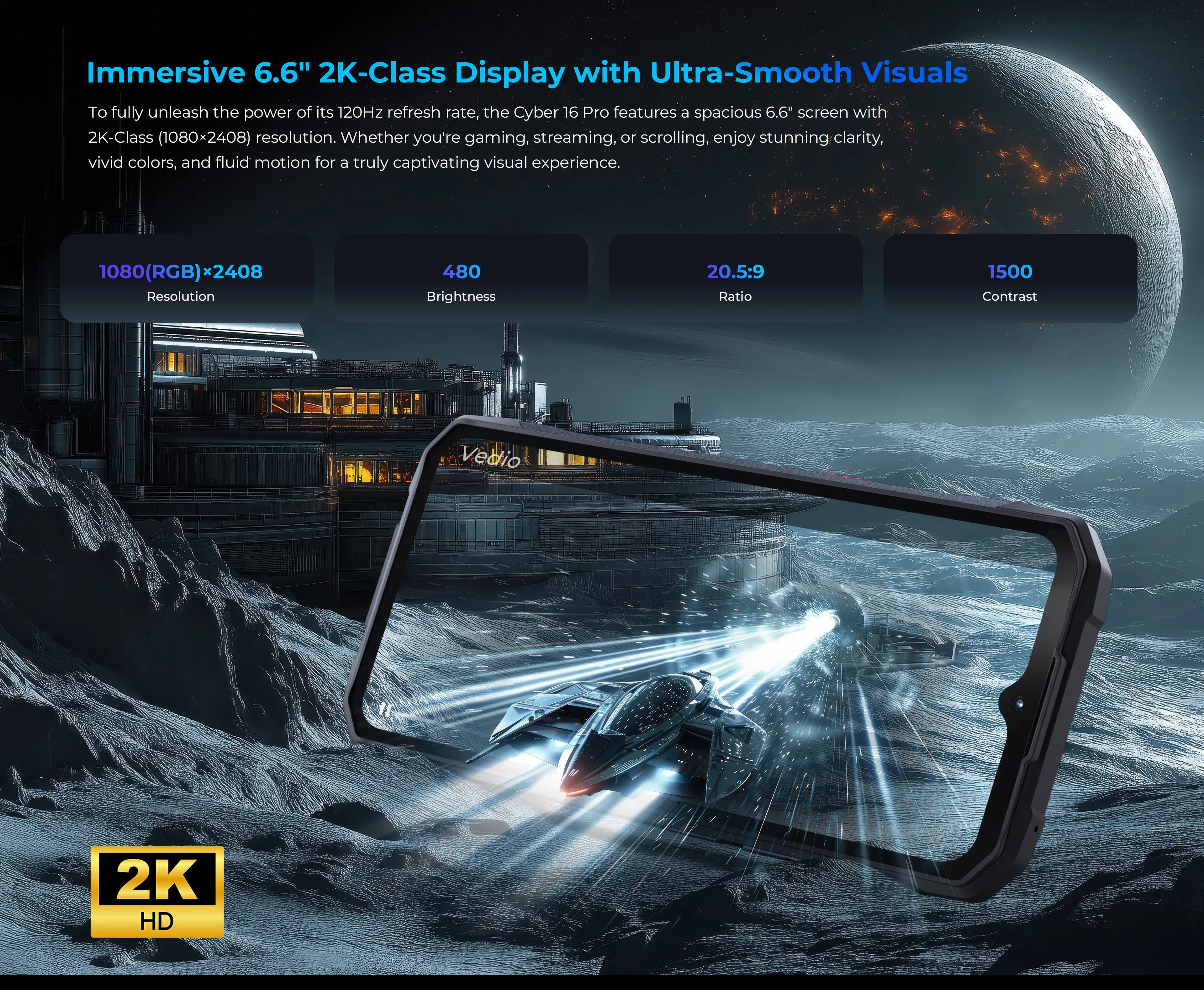 To fully unleash the power of its 120Hz refresh rate, the Cyber 16 Pro features a spacious 6.6" screen with 2K-Class (1080×2408) resolution. Whether you're gaming, streaming, or scrolling, enjoy stunning clarity, vivid colors, and fluid motion for a truly captivating visual experience.