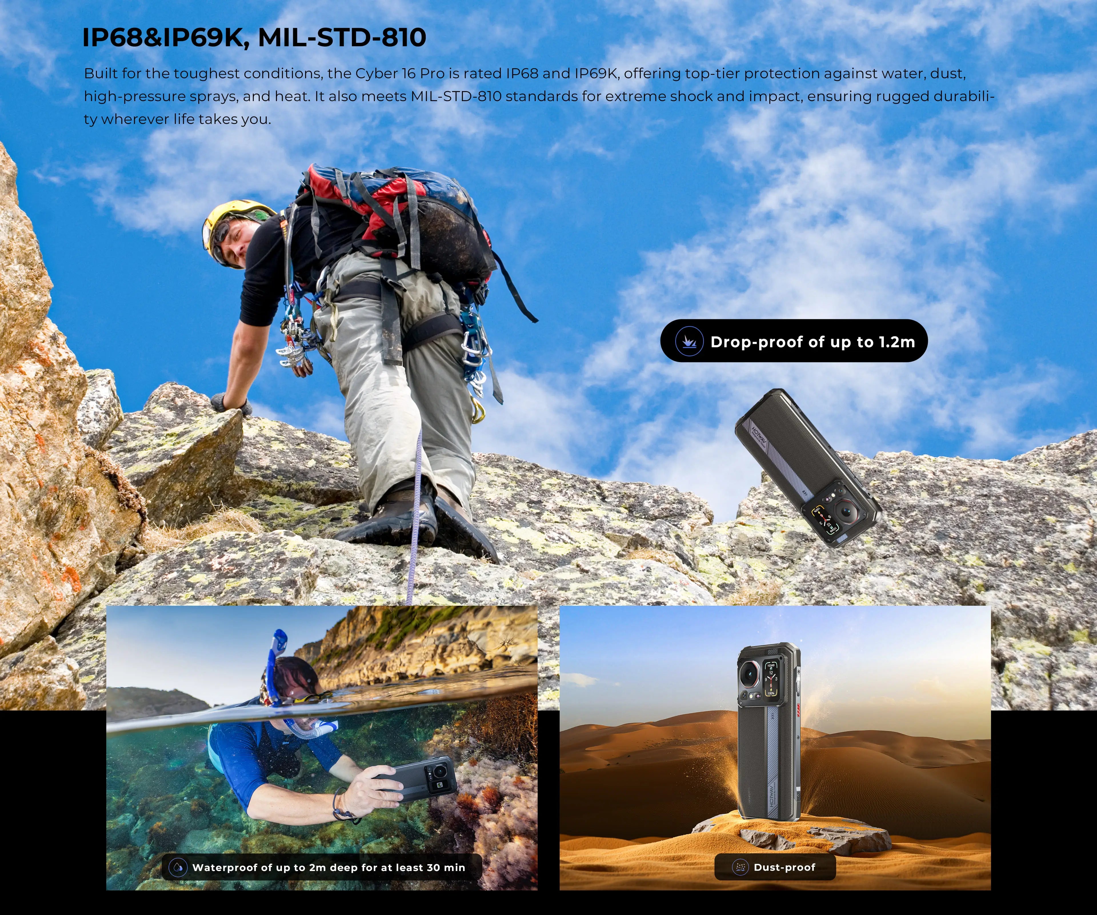 Built for the toughest conditions, the Cyber 16 Pro is rated IP68 and IP69K, offering top-tier protection against water, dust, high-pressure sprays, and heat. It also meets MIL-STD-810 standards for extreme shock and impact, ensuring rugged durability wherever life takes you.