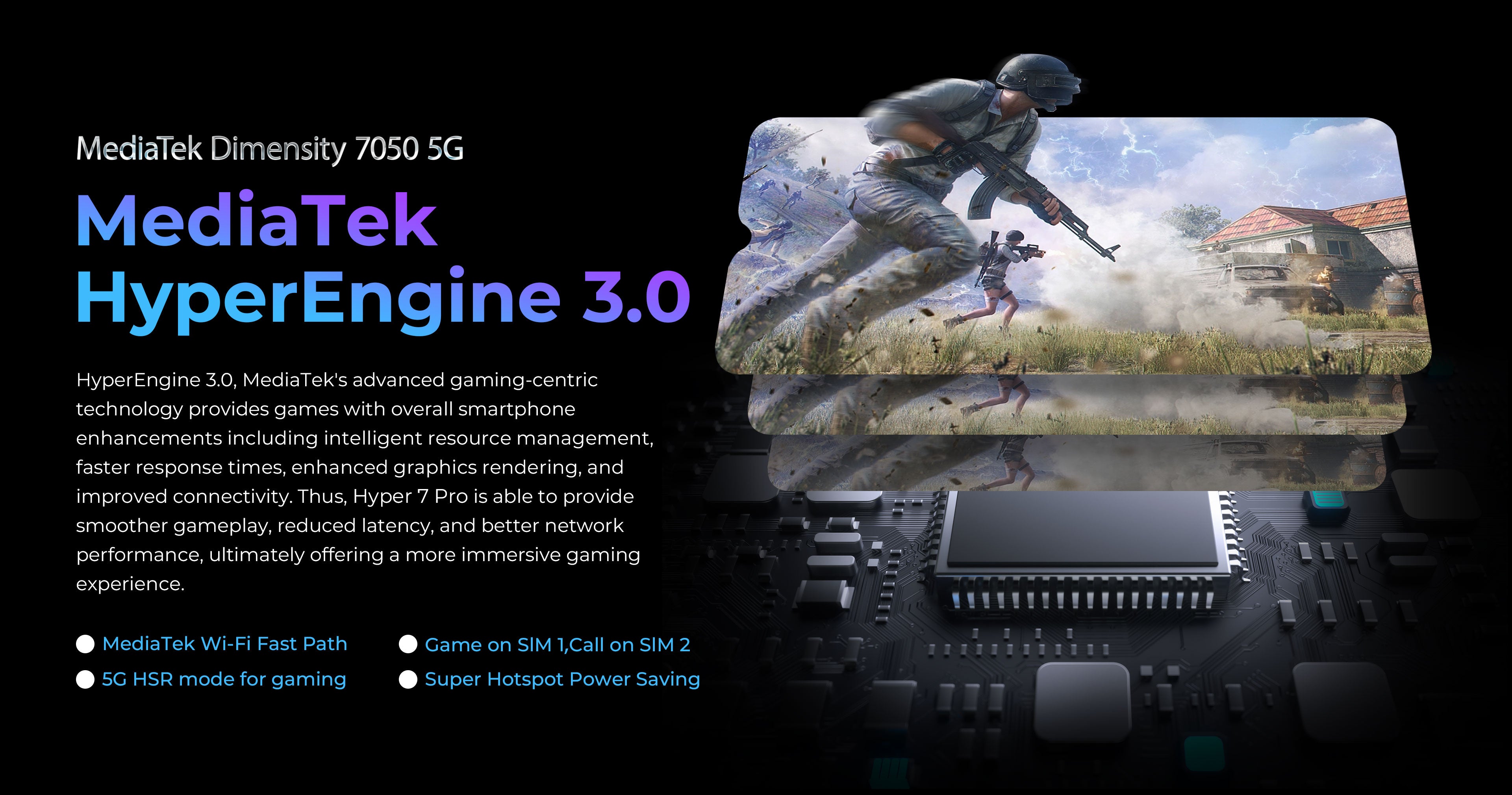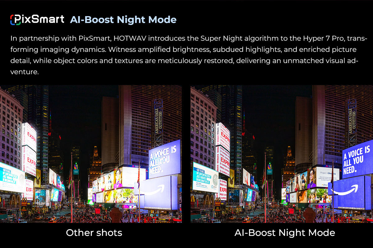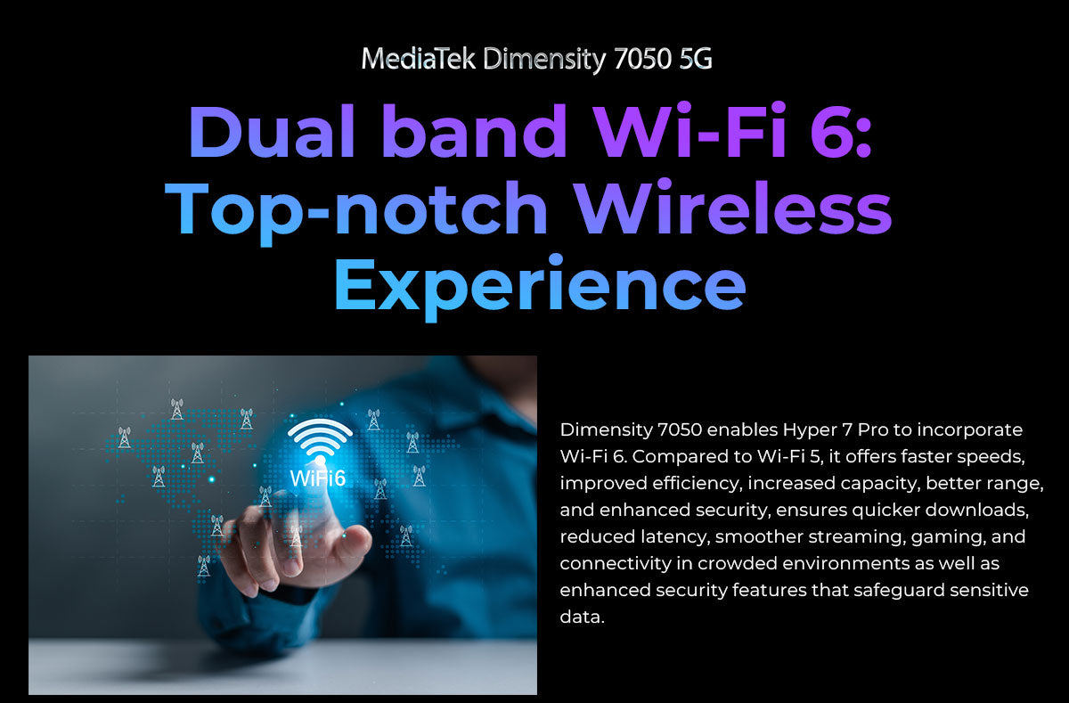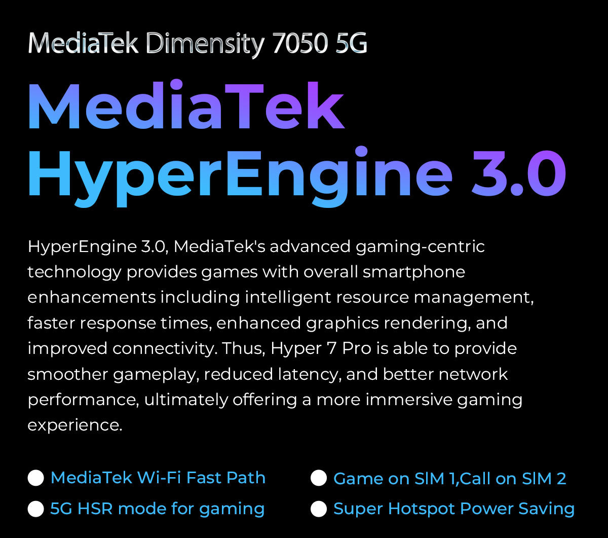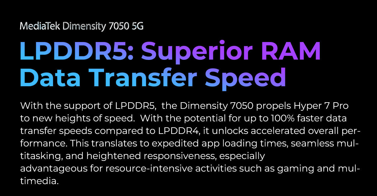 Driven by the MediaTek Dimensity 7050 chipset and enhanced by Pixsmart Al-Boost technology, the Hyper 7 Pro maximizes the potential ofits 200Mp Samsung ISOCELL HP3 lens. Enjoy the incredible detail of 200 milion pixels and ultra-high resolution with the Hyper 7 Pro lt's perfect for nighttime photography and boasts advanced autofocus for sharp, clear images.