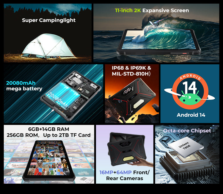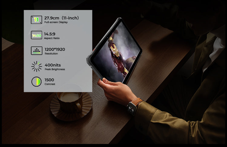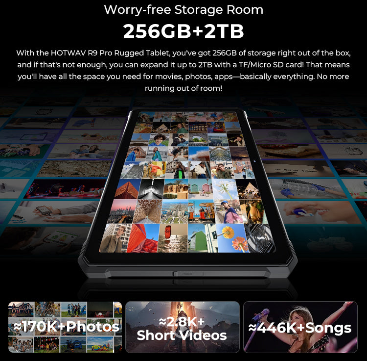 The HOTWAV R9 Pro Rugged Tablet comes with a stunning 11" 2K-class display. This screen gives you crystal-clear visuals, whether you're streaming your favorite shows, gaming, or getting some work done. The large size and sharp detail make everything pop, giving you a super immersive experience, all while staying easy on the eyes. Enjoy top-notch visuals from now on.